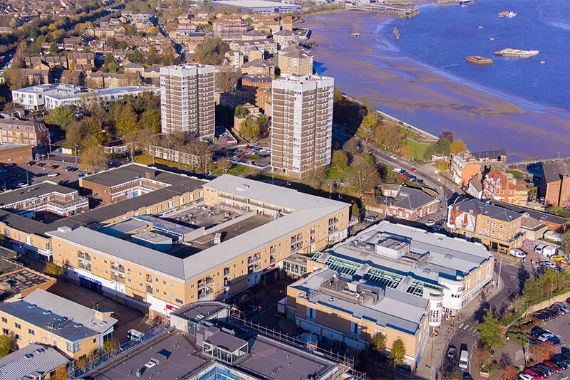 A shopping centre in Bexley set back from the River Thames with 50 retail units and substantial parking provision.